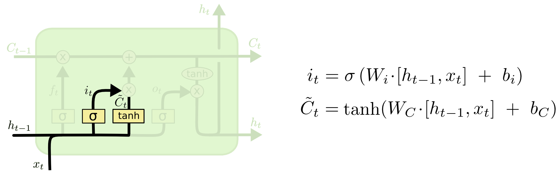 다음 단계는 cell state에 저장할 새로운 정보를 결정하는 것입니다. 이는 2가지 부분을 가지고 있습니다. 첫번째로 "input gate 층" 이라고 불리는 sigmoid 층은 어떤 값을 업데이트할 지 결정합니다. 다음은 tanh 층이 새로운 후보값인 벡터$\tilde{C_t}$ 를 만들어 내고, 이 값은 상태에 더해집니다. 다음 단계로, 우리는 이 두가지를 상태에 업데이트하기위해 결합하게 됩니다.
