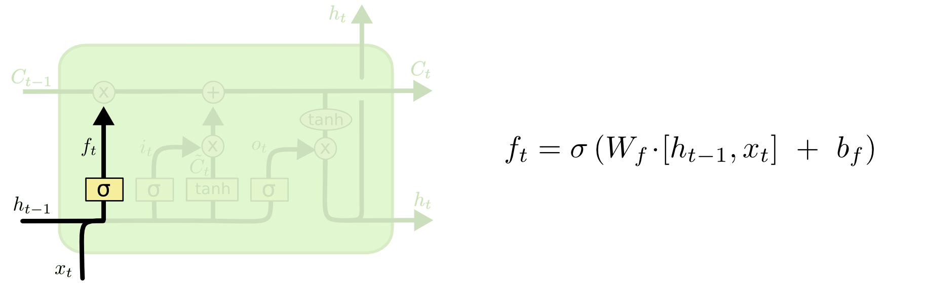 LSTM의 첫번째 스텝은 cell state로 부터 우리가 무슨 정보를 전달해야할 지 결정하는 것입니다. 이 결정은 "forget gate layer" 라고 불리는 sigmoid 층에 의해 수행되어 집니다. 이는 $h_t$ 와 $x_t$ 를 전달받아, cell state $C_{t-1}$ 의 각자 수에 0과 1 사이의 숫자값을 출력합니다. $1$ 은 "완전이 이 정보를 지키시오"를 의미하며, $0$은 "완전히 이 정보를 지우시오"를 의미합니다.