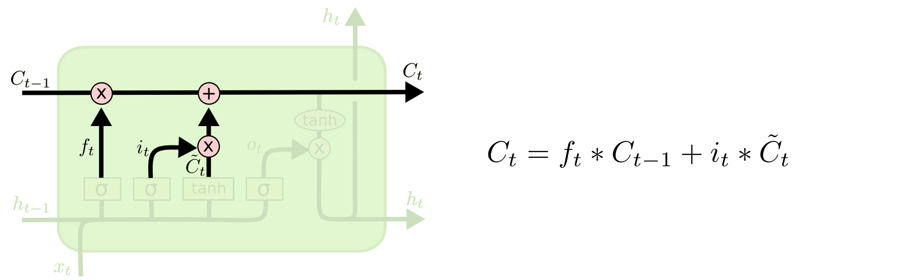 우리는 오래된 것을 $f_t$로 곱하고 이전에 잊기로 결정한 것을 잊어버립니다. 그리고 나서 우리는 그것을 $\tilde{C_t}$ 에 곱합니다. 이는 얼마나 우리가 각각의 상태 값을 업데이트할 지 스케일 된 새로운 후보 값입니다.
