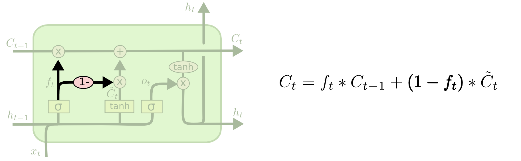 Another variation is to use coupled forget and input gates. Instead of separately deciding what to forget and what we should add new information to, we make those decisions together. We only forget when we’re going to input something in its place. We only input new values to the state when we forget something older.