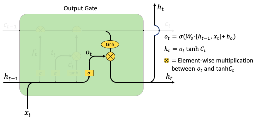 - Output gate: 여기 ot 는 t 시점의 output gate입니다. 그리고 W0 과 b0 는 output gate의 가중치와 편향입니다. 은닉층 ht 는 다음 시점으로 이동하거나 yt 로 출력됩니다. 다음 코드의 Line 12 에서, yt 는 다른 ht 에 tanh를 적용하여 얻어집니다. output gate ot 가 output yt 가 아니라는 점에 주목해주세요. 이는 단순히 output을 컨트롤하기위한 "gate" 입니다.
