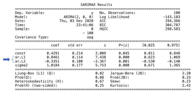 ARIMA 모델은 자기상관함수 (ACF)와 부분자기상관함수 (PACF) 그림을 사용하여 AR 과 MA 항의 차수를 결정합니다. 그림(A.1)은 ACF가 점진적으로 0에 수렴하는 것을 보여주는 반면, PACF는 두가지 중요한 스파이크를 가지고 있음을 보여줍니다. 이 제안으로 우리는 AR2 모델 사양을 테스트할 수 있습니다. (ACF와 PACF의 규칙을 보고 싶다면, 상세한 내용은 여기를 클릭해주세요.) 그림(A.2)는 추정된 모델의 계수를 나타내며, 우리가 정한 것들과 가깝습니다.
