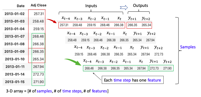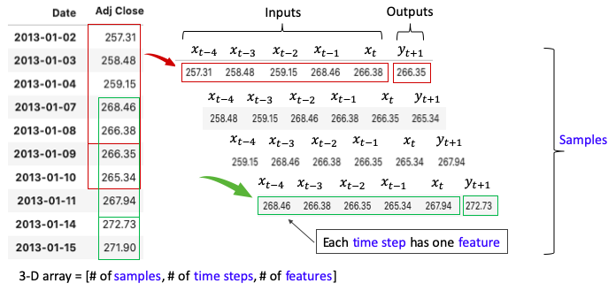 - RNN/LSTM/GRU가 3D 텐서를 입력값으로 요구한다. RNN/LSTM/GRU에 대한 일변량 주가 데이터에서 학습 데이터를 어떻게 구성해야 할까?