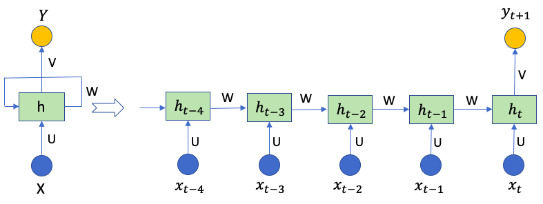 회귀를 배우는 것 처럼 RNN, LSTM, GRU를 배우는 것은 쉽지 않습니다. 많은 수업에서 종종 회귀와 딥러닝 사이의 지식의 갭이 있다고 느꼈습니다. 용어의 차이 또한 지식의 갭을 만듭니다. 딥러닝으로 점프하기위해 많은 준비가 필요하며, 성공적으로 점핑한 학생들은 회귀로 쉽게 되돌아가지 않을 수 있습니다. ( 이 말장난이 마음에 들지도 모르겠네요 ) 이는 회귀와 표준 피드포워드 신경망을 잇기 위해 "회귀에 친숙한 방식으로 딥러닝 설명하기"를 작성하는데 동기부여가 되었습니다. RNN/LSTM을 배우는데 있어서, 아마도 그림(A)처럼 RNN이나 LSTM의 추상적인 다이어그램을 봤을 지도 모릅니다. 하지만 여전히 잘 모르겠지요. 장애물의 일부는 라벨링입니다. 이 다이어그램이 시계열 데이터가 정확히 어디에 있는지 정확히 이름 붙일 수 있길 바랍니다. ARIMA 모델에서는 어떻게 Yt , Yt-1 , Yt-2 , ... , 가 Yt+1을 만들어내는지 수학적인 공식으로 확인할 수 있습니다. 하지만 RNN 다이어그램으로 어떻게 이것들을 표시할까요?