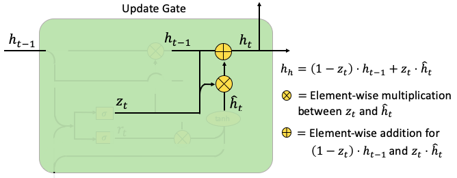 - Update Gate: (Part 2) 이 부분은 가중치 zt 에 따라 ht-1과 hat(ht) 사이의 가중 평균을 계산합니다. 만약 zt 가 0에 가깝다면 과거 정보는 매우 적게 기여할 것이고 새로운 정보가 더 많이 기여할 것입니다.