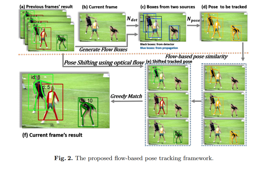 아래의 그림은 제안된 포즈 추적 프레임워크의 흐름을 보여줍니다. 비디오에서 포즈 트래킹은 먼저 사람의 자세를 추정하여 고유한 식별자를 제공한 다음, 프레임을 추적함으로써 이루어집니다.
