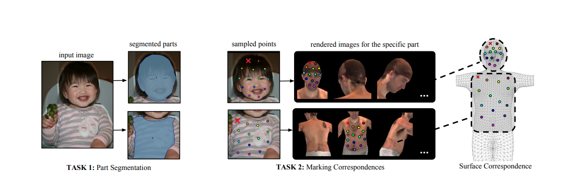 이 논문은 INRIA-CentraleSupelec과 Facebook AI Research로부터 발표되었으며, 그들의 목적은 RGB이미지의 모든 사람의 픽셀들을 사람 신체의 3D 표면에 매핑하는 것이었습니다. 또한 DensePose-COCO dataset을 소개했습니다. 이는 50K COCO 이미지를 이미지 대 표면으로(image-to-surface) 대응시켜 수동으로 주석을 단 데이터셋입니다. 이 저자는 이 데이터셋을 사용하여 배경, 막힘, 규모 변화가 있을 때, 밀도의 대응을 제공하는 CNN 기반 시스템을 학습하였습니다. 대응관계는 기본적으로 한 이미지가 다른 이미지의 픽셀에 대응하는 방식을 나타냅니다.