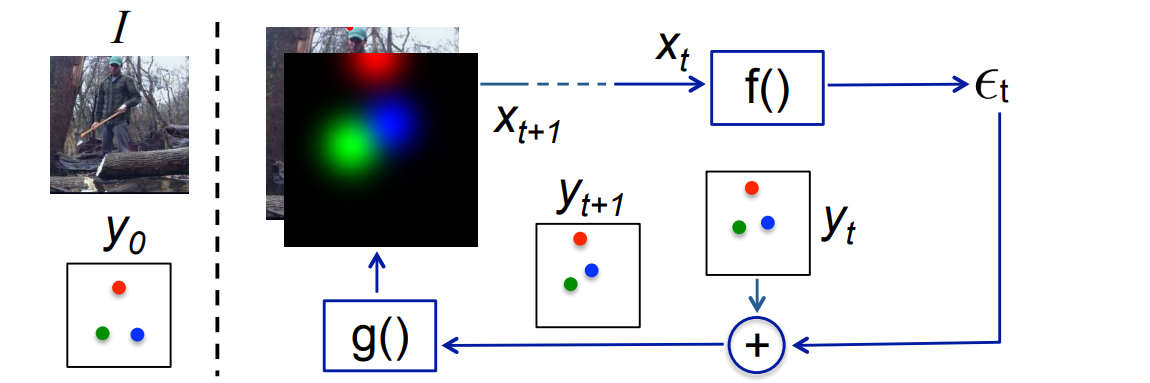 아래의 그림은 2D 사람 포즈 추정에 대한 반복적인 에러 피드백 실행을 보여줍니다. 왼쪽 패널은 입력이미지 I 와 초기 키포인트 추정값 Y0를 보여줍니다. 여기서 3가지 키포인트는 오른쪽 손목 (녹색), 왼쪽 손목 (파란색), 머리 꼭대기 (빨간색)에 대응합니다. 이 아키텍쳐의 함수 f는 합성곱 신경망으로 모델링됩니다. 함수 g는 각 2D 키포인트 위치를 가우시안 히트맵 채널로 변환합니다.