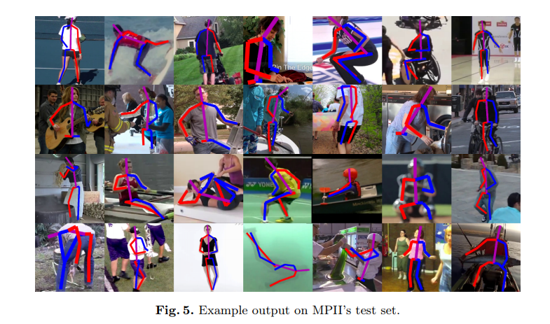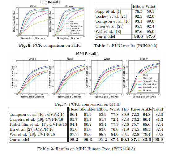 모델의 PCKh-0.5 점수는 87.95% 라는 최신의 결과를 달성하였고, PCKh0.5 점수는 발목에 대해 78.28% 를 달성했습니다. Caffe를 사용하여 실행되었고, 코드는 오픈 소스화되었습니다.