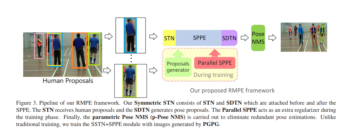 이 프레임워크에서, 사람 탐지기로 부터 얻어진 경계상자는 "Symmetric STN + SPPE" 모둘로 입력됩니다. 그리고나서, 포즈 제안은 자동으로 생성됩니다. 추정된 인간 포즈를 얻기 위해, 이 포즈들은 모수적 포즈 NMS (parametric pose NMS)에 의해 미세 조정됩니다. 학습할 때, 지역 최소치를 피하기 위하여 "병렬 SPPE"가 도입됩니다.