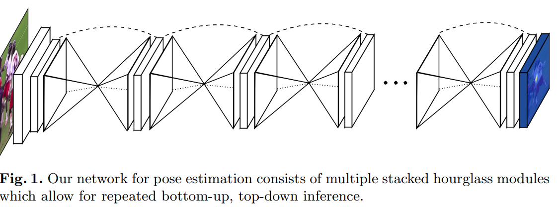 이 논문은 반복되는 bottom-up과 top-down 과정이 중간 감독과 함께 그들이 제안하는 네트워크의 성능을 향상시킨다고 주장한다. 이 네트워크는 "겹겹이 쌓인 모래시계 (stacked hourglass)"라고 언급되는데, 마지막 예측값을 생성하기 위해한 투표(polling)와 표본추출(upsampling)의 연속적인 과정 때문이다. 이 논문의 저자는 Michigan 대학교 소속이다.