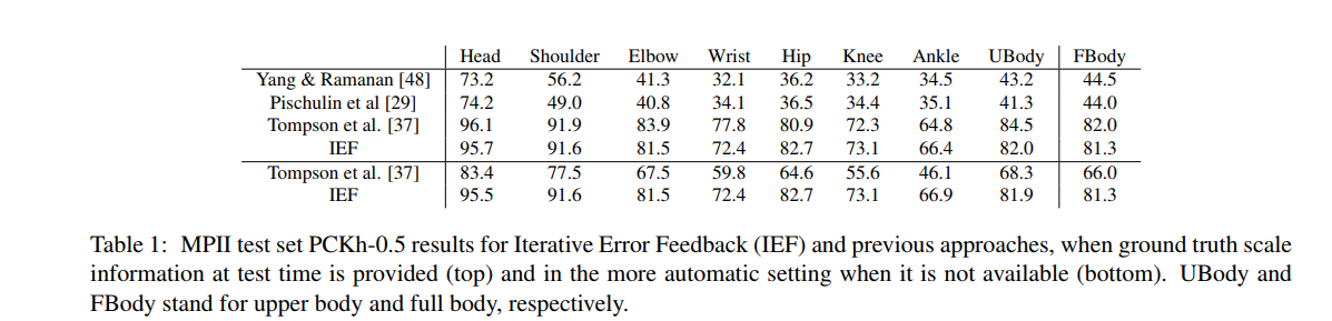 출력 값은 한번에 예측되지 않습니다. 하지만, 오류 예측을 피드백하는 자가 수정 모델이 사용됩니다. 저자는 이 과정을 반복적인 에러 피드백 (Iterative Error Feedback (IEF)) 라고 불렀습니다. 이 모델은 MPⅡ 와 LSP 벤치마크에 대해 관절 포즈 추정에 대한 좋은 결과를 생산했습니다.