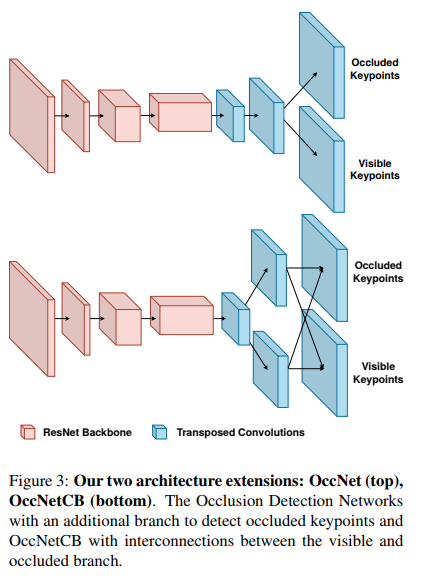 이 논문은 또한 두가지 폐색 탐지 네트워크 (occlusion detection networks)를 소개합니다; Occlusion Net과 Occlusion Net Cross Branch 입니다. Occlusion Net은 이전 층에서 관절 표현을 학습할 수 있도록 두개의 전치된(tranposed) 컨볼루젼 후에 분할됩니다. Occlusion Net Cross Branch는 하나의 전치된 컨볼루젼 이후에 분리됩니다. 폐색 탐지 네트워크는 포즈당 두 세트의 히트맵을 출력합니다. 한 히트맵은 눈에 보이는 키포인트들에 대한 것이고, 다른 히트맵은 보이지 않는 키포인트들에 대한 것입니다.