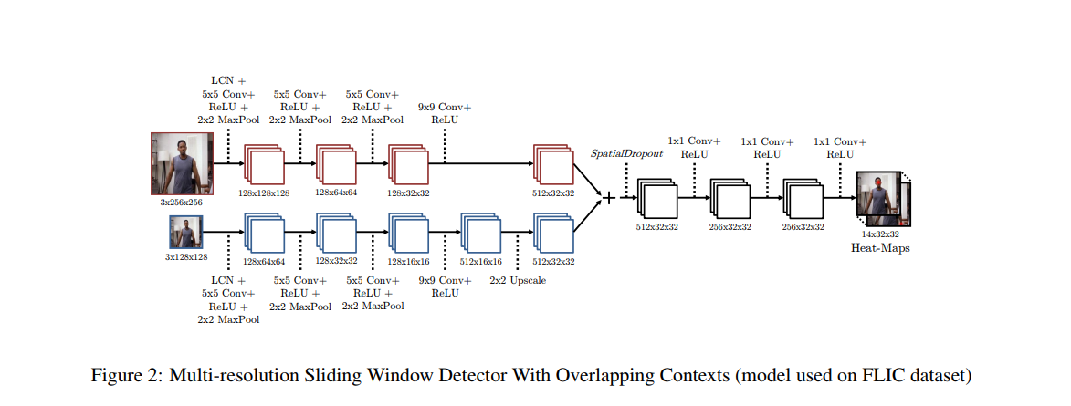 이 논문은 또한 지역화(localization) 정확도를 향상시키기 위하여 히트맵 회귀 모델의 은닉층으로 부터 feature들을 사용하는 네트워크를 소개합니다. 이 모델은 멀티-해상도 ConvNet 아키텍처를 사용하고, 겹치는 문맥을 가진 슬라이딩 윈도우 탐지기를 사용하여 조악한 히트맵 출력값을 생성합니다. 슬라이딩 윈도우는 보통 고정된 높이와 너비를 가진 직사각형 박스입니다. 이 박스는 이미지를 가로질러 슬라이드합니다. 박스가 슬라이드 할 때, 분류기는 해당 섹션에 현재 작업에 관심있는 개체가 있는지 여부를 식별하려고 합니다.