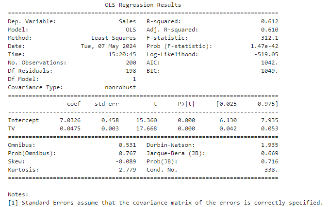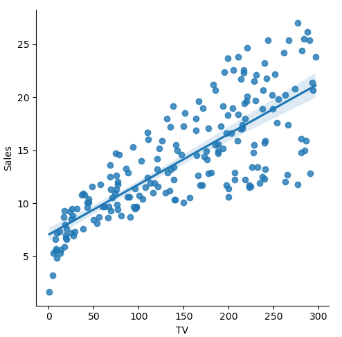 lm2 = smf.ols(formula = 'Sales ~ TV', data = Ad_df).fit()