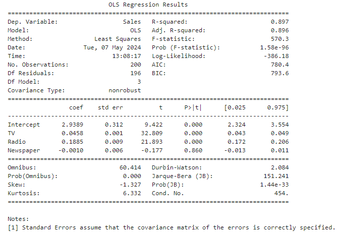 mlr_model.fit(Ad_df[['TV', 'Radio', 'Newspaper']], Ad_df['Sales'])