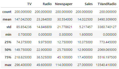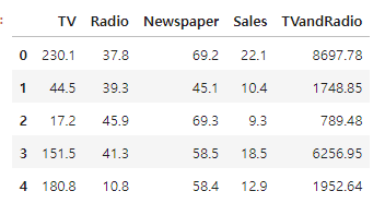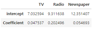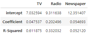 - TV가 61%의 높은 R^2 값을 가지고 있는 것을 볼 수 있습니다. 그다음은 Radio, Newspaper 순입니다.