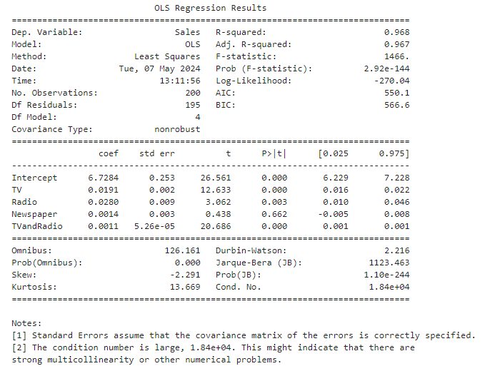 lm3 = smf.ols(formula = 'Sales ~ TV+Radio+Newspaper+TVandRadio', data = Ad_df).fit_regularized(method = 'elastic_net', L1_wt = 0) # L1_wt = 0 : Ridge fit