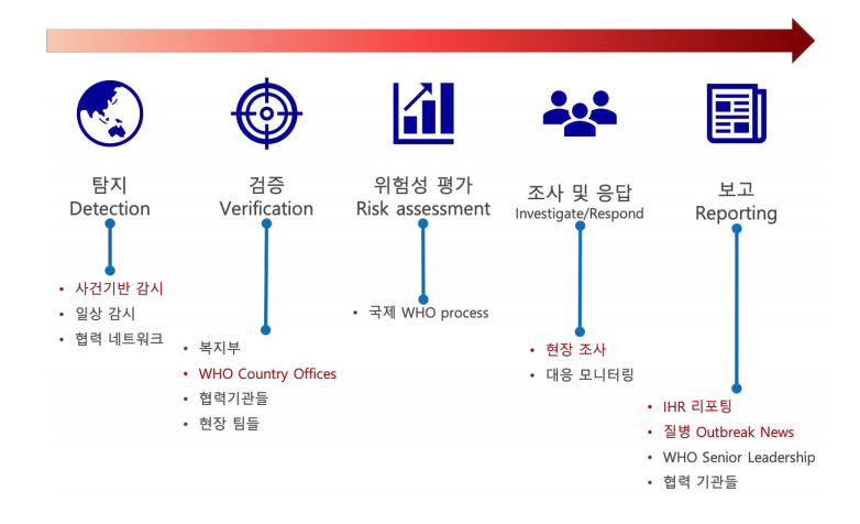 WHE 프로젝트에서 정의한 보건의료분야의 응급정보 및 위험도 평가 과정은 다음과 같습니다.